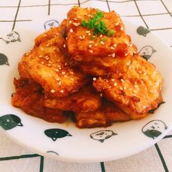 10. Heat oil in the pot, pour in the sauce and tofu cubes and stir-fry until the juice is coated on the surface of the tofu (fry for one minute left and right), take out and serve on a plate