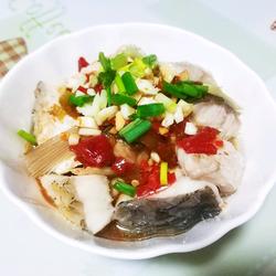 9.Add a spoonful of chopped pepper.Put water in the pot, bring it to a boil, add fish pieces, steam over medium heat for 10 minutes, and steam for 2 minutes.