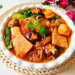 9.Put in mushrooms, frozen tofu, and meatballs, and bring to a boil over high heat.