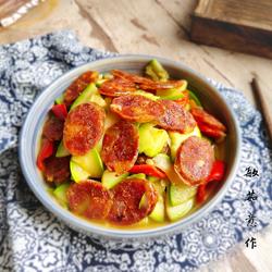 9. Stir-fry the red pepper, sausage and zucchini together, then add a little light soy sauce to enhance the freshness.