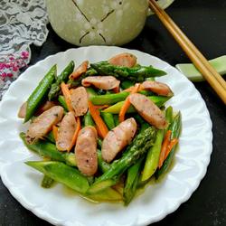 8.Plate it on a plate and take a picture of the finished product.A delicious and nutritious sausage-fried asparagus is completed.