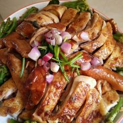 5. Use a knife to cut into pieces, put some chives on the surface and place on a plate.Chop the surface evenly and pour some marinade on top of the chicken