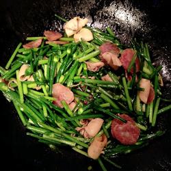 1.Tear off the skin of the sausage and slice it into slices.Wash the cuttlefish and cut into half.Chop the garlic sprouts