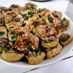 14. Use chopsticks to make a thin slit in the middle of the tofu (be sure to make it deeper and stuff it) You can stuff more meat filling)