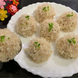 6.Take the meat filling and roll it into small balls, roll it with glutinous rice and roll it again