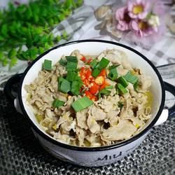 4. Add potato starch to the pot and cook until softened, then remove and add Blanch mushroom slices until cooked.