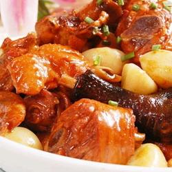 3. Heat the pot, add rapeseed oil, add ginger slices, garlic and star anise, and stir until fragrant.Add some chicken nuggets and stir-fry the chicken nuggets with dark soy sauce! Pour in water (not too much water, just enough to cover the chicken pieces), then add the prepared seasonings.If the color of soy sauce is not enough, add some soy sauce to enhance the color! Cover the pot and cook over medium heat for 5 minutes