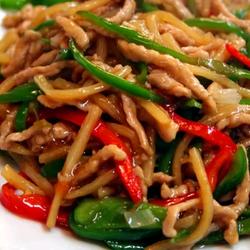 3. Heat the oil in the pot and add the green and red peppers Stir-fry the shredded meat, add the shredded pork, add appropriate amount of salt, MSG and Tunku soy sauce, use a little oil! Put a little water gorgon powder! Stir fry a few times and drizzle with a little salad oil! Plate and serve!