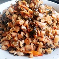 8.Add the dried cabbage and stir-fry until fragrant, add some soy sauce to taste before serving