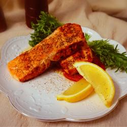 8. Squeeze a slice of lemon juice, grind in petrel and cracked black pepper on the hot salmon