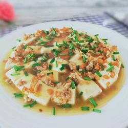 7.When the time is up, take out the tofu plate, pour the excess soup into the pot, and add Bring cooking wine, soy sauce, salt, chicken essence, chopped green onion to a boil, and thicken with water and starch.
