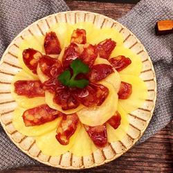 3.Put the potato slices into a plate and sprinkle a little salt on the surface of the potatoes.(Just a little salt is enough, the sausage itself is also salty)