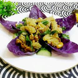 8. Heat the pan and add oil, sauté garlic until fragrant, stir-fry chili first, then stir-fry squid flowers, finally add cashews and salt , light soy sauce, oyster sauce and chicken essence, mix well and take out to a plate.