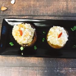 8.Wash the mushrooms and remove the stems, and put the glutinous rice balls on top.Steam for 15 minutes