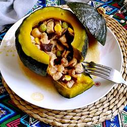 7.Will be fried Put the good chicken and shiitake mushrooms into the pumpkin.I put a few corns and green beans, you don’t have to put them in if you don’t have them