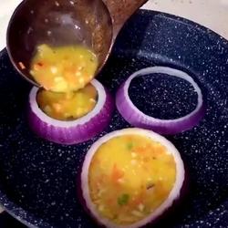 7.Pour the eggs into the onion rings, fry until the egg liquid is solidified, and then fry the other side.good.