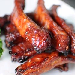 10. After baking for 16 minutes, use a brush to brush the cooked syrup On the surface of the ribs, continue grilling for 1 minute.Don't bake it for too long after brushing it with syrup, as the sugar will burn and become bitter.