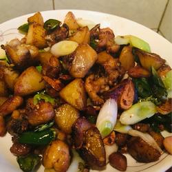 23.Fried When the green onions change color and are taken out of the pot, the slightly spicy potato roasted chicken is ready