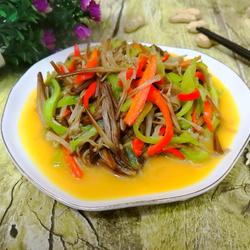 2. Heat oil in a pan, add green and red pepper shreds and stir-fry