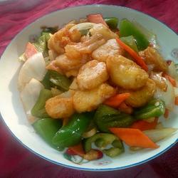 8.Add carrot slices, green pepper chunks, and onion chunks, and stir-fry for a few times.