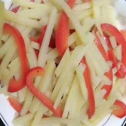 2.Add peanut oil to the pot, and when the oil is hot, add shredded potatoes and red pepper