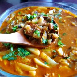 4.About fifteen minutes, the potatoes have changed.Add the stir-fried pork and stew together.five minutes.Finally add chicken essence and the side dishes prepared in the previous step.