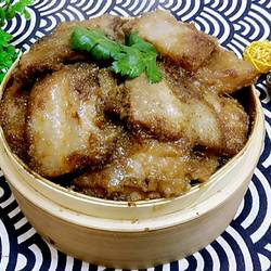 2. Add steamed rice flour, salt, ginger slices, soy sauce, light soy sauce and chicken essence, mix well and marinate 20 minute.