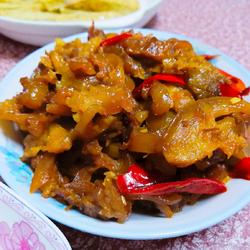 2. Slice the peppers.Put the bacon slices into the pan and stir-fry over high heat, add chili and stir-fry, add soy sauce to color and season, and it is ready to serve.