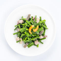 6.Add pork, dried shrimps, konjac, salt and seasoning powder, stir-fry quickly for 1 minute