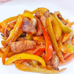 Pork ( 1 piece ) | Colorful peppers ( 1.5 pieces ) | Peanut oil (appropriate amount) | Chopped green onion and ginger ( appropriate amount ) |