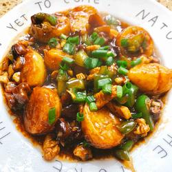 4. After the aroma comes out, add the diced chicken one by one Stir-fry the diced mushrooms and green peppers, then add the fried Japanese tofu, add oil, sugar and a little light soy water (a little starch), wait until the juice is reduced slightly, then add chicken essence and cook