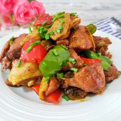 9. Take out the inner pot when the time is up, pour it into the wok, add salt, chicken essence, and put Heat the green and red peppers over high heat to reduce the juice.