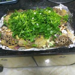 5. Pour the cooked side dishes on top of the grilled fish, and then put Bake in oven for five minutes.