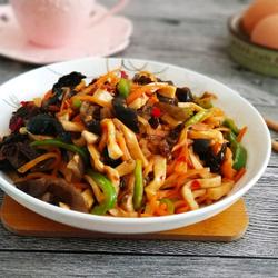 8.Add green pepper shreds and carrot shreds and stir-fry a few times.