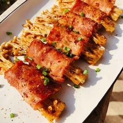 2.Take a handful of enoki mushrooms, roll them tightly with bacon, and pin a toothpick