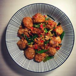 6. First put in the pot and stir-fry the auxiliary ingredients.When the green pepper is almost cooked, add the fish balls and stir-fry.Then add a little water, add chopped pepper when the juice is almost reduced, stir-fry and remove from the pot.