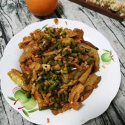12.Add the fried eggplant strips and make them evenly coated with sauce.