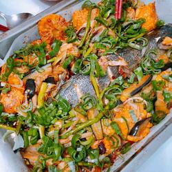 12.Pour in the prepared vegetables and roast them On the side of the sea bass, some fish falls out from the middle, then put it in the oven and bake it at 170 degrees for five minutes