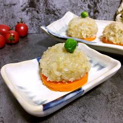 6. Use the tiger’s mouth to squeeze out the shrimp meatballs and put them in the drained glutinous rice.Roll it in a circle, place it on the sliced carrots, and steam over medium heat for 30 minutes.