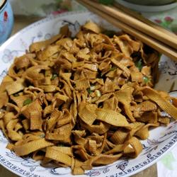 6.Pour in the cut tofu skin and turn it over evenly
