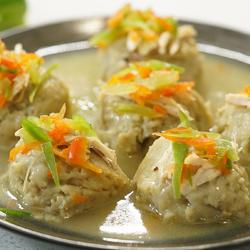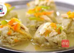 4. Place lotus leaves on the steamer, turn on the heat and put the meatballs in, garnish with shredded chicken, red and green peppers, steam for about 5 minutes , take out and serve on a plate
