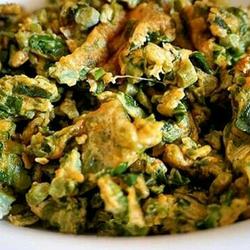 4. Add salt to taste just before serving.The fried toon has lost its red color, leaving a dark green color.The eggs and toon buds are wrapped around each other, making it indistinguishable.