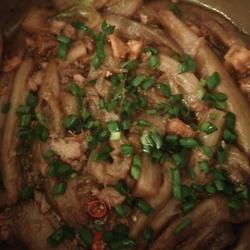 6. Saute the salted fish until fragrant, put it into a casserole, add half a bowl of water, add an appropriate amount of salt and light soy sauce, mix well, pour it into the casserole, and cook After twenty minutes, sprinkle with chopped green onion and it is ready to eat