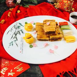 10. Arrange the duck meat strips with modified knives into a saddle-shaped plate, match them with cute little yellow duck steamed buns and garnish with flowers and plants
