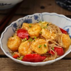 3. Cut off the roots of the enoki mushrooms, pick and wash them, and cut the red pepper into small pieces, leaving just enough Add the chili peppers together to garnish the dishes.If you don’t have them, you don’t have to put them in.