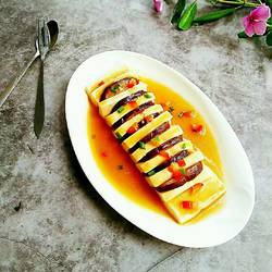 Put the fried shiitake mushroom slices Sandwich with tofu slices and steam for 12 minutes,