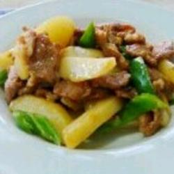 6.Saute until the meat is cooked.Pour the potatoes into the pot and stir-fry twice