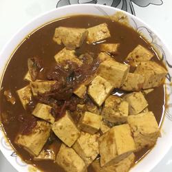 1. Prepare the ingredients and boil the tofu in boiling water , heat the oil in the pan and add peppercorns, dried ginger, chopped onion and garlic.