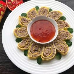 8.The steamed egg rolls are cut into pieces and placed on a plate with chili oil