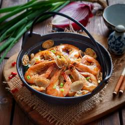 4.Heat oil in a pan, add prawns and stir-fry until they change color